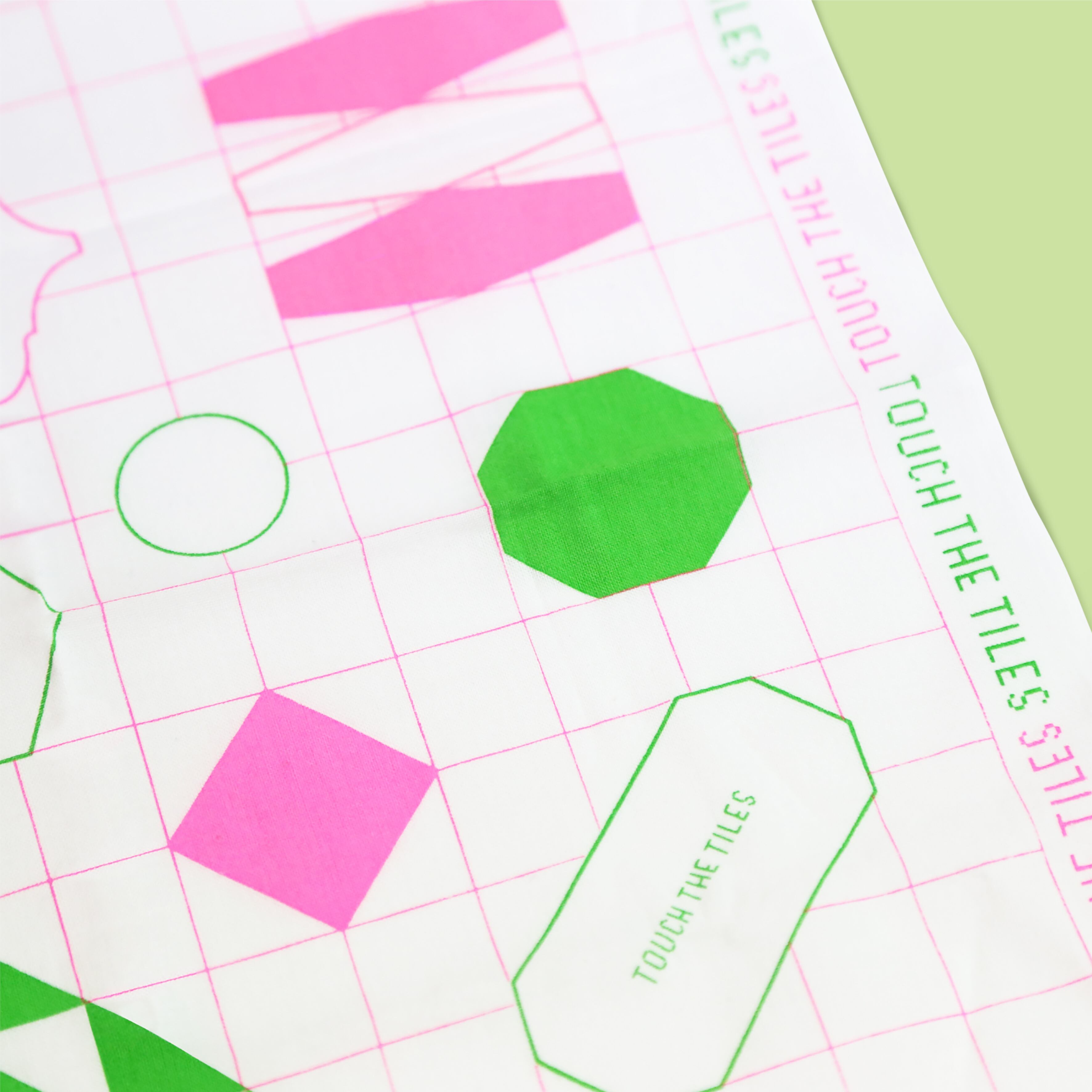 さまざまなタイルの形をあしらったデザインの手ぬぐい生地のハンカチです。